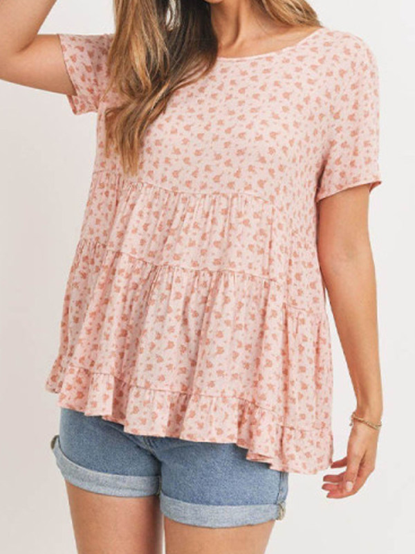 V neck short sleeve floral pattern bare back loose dress.